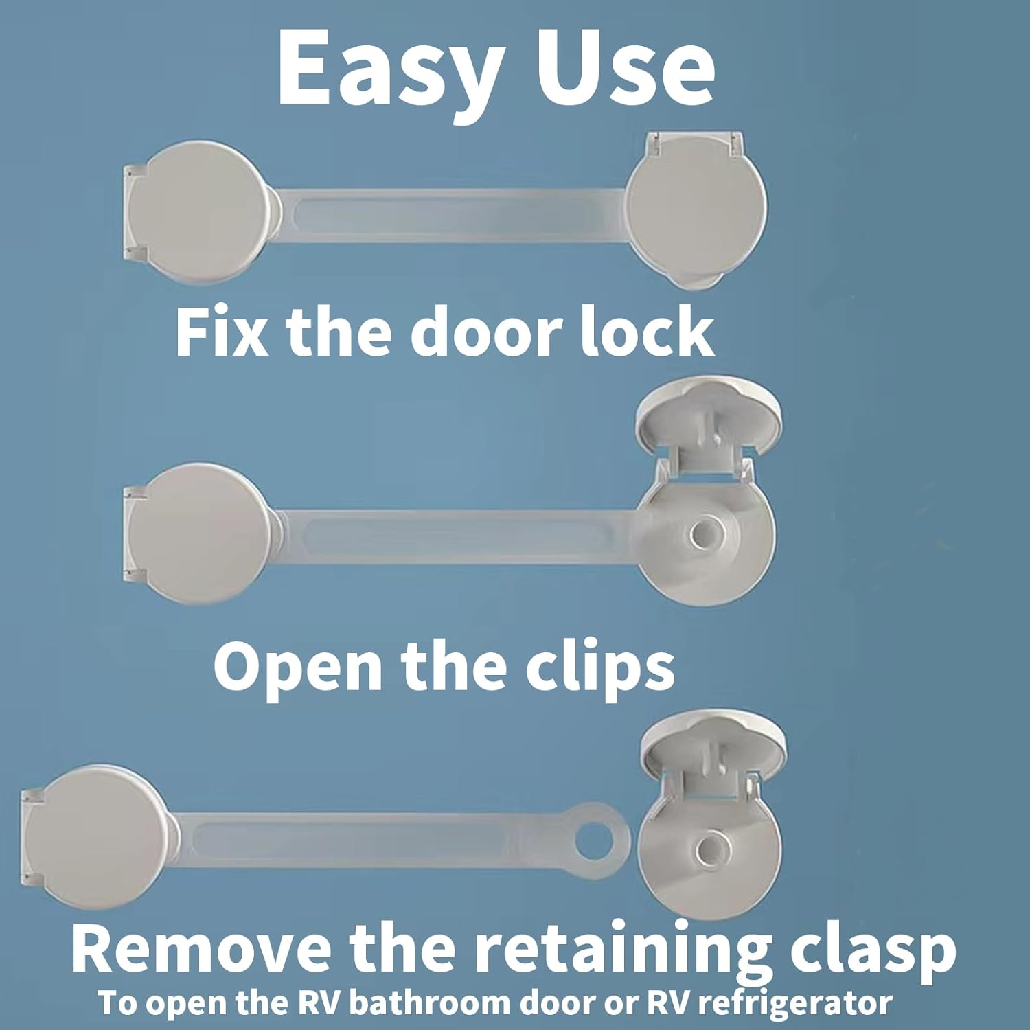 - Simple and Secure: Our innovative design ensures that your rv drawer, cabinet and refrigerator securely close while you're on the go, adding extra convenience to your travels. No more unexpected surprises on the road. Simply peel off the double-sided tape to lock your rv cabinet door securely in place
