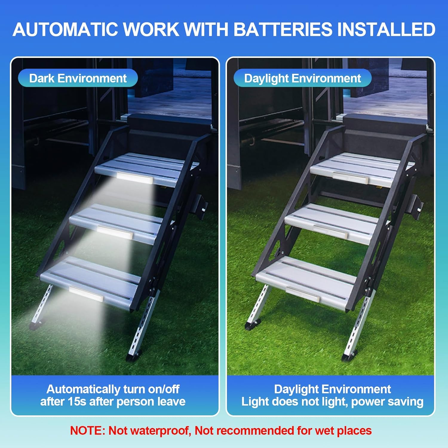 - Easy to Install and Use: Our motion lights for RV steps are powered by 4 AAA batteries (not included) and requires no drilling or screws for installation. Simply peel off the tape and attach the magnetic strip to the location you want to install, and the wireless trailer step lights will automatically attach to the strip. The adhesive on the mounting strip is highly adhesive, so you don't have to worry about it falling off